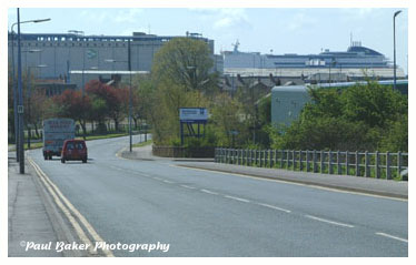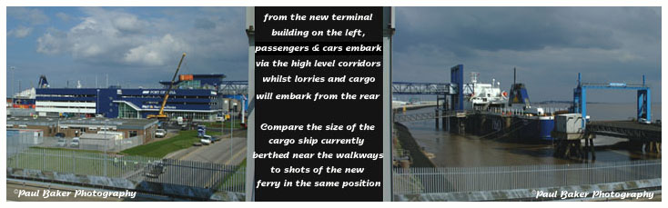Above - the two arrows on the left shot indicate the bridge of the cargo ferry and the walkway superstructure peering over the dockland skyline, compared to the skyline being dwarfed by the new Cruise Ferry !
